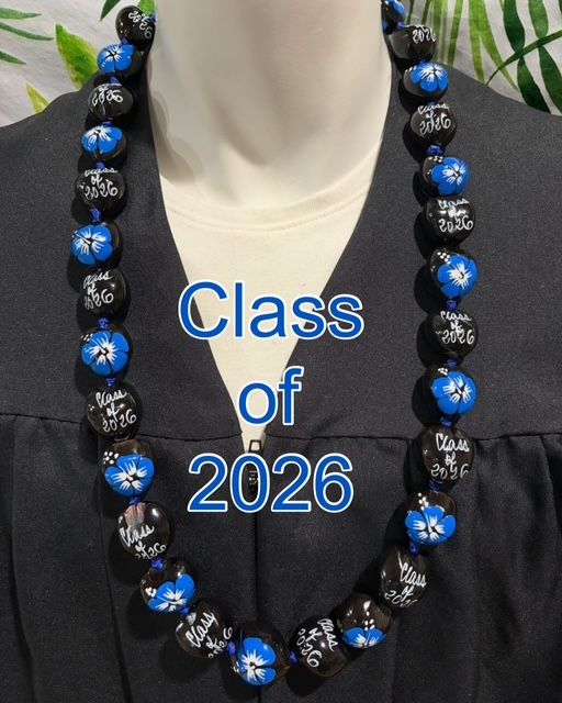 ****You will receive a lei with Black Kukui Nuts with Blue Hibiscus Flower Nuts and "Class of 2026" custom lettering.